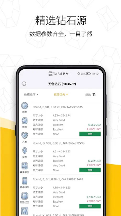 The Ridiamonds APP is an information inquiry application that lets you query the stocks of diamonds in real time. It is dedicated to let diamonds retailers query the diamonds information they need better and faster, as well provide the terminal consumer with corresponding price. Ridiamonds offers users plenty of a variety of diamonds which are prompt goods. And each diamond is supplemented photo, video, parameters and certificate, that enable diamonds retailers to know about items information more intuitively. What's more, Ridiamonds offers all registered users to download photos and videos, and provides professional consultant that can solve customers related problem quickly.
