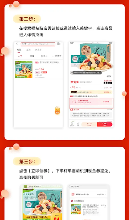 3. Built-in mobile Taobao module, one-click free coupons and jump to mobile Taobao to place orders for corresponding products. You need to log in to your mobile phone Taobao account, and the internal coupons will be automatically used when placing an order. All purchased orders can check the order details in Taobao and Alipay APP.