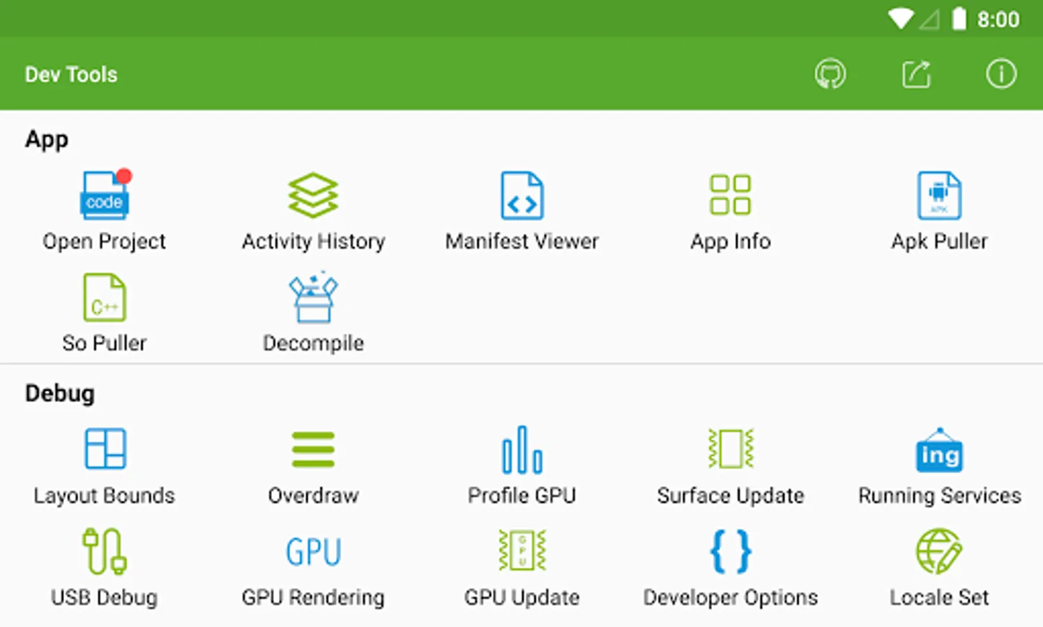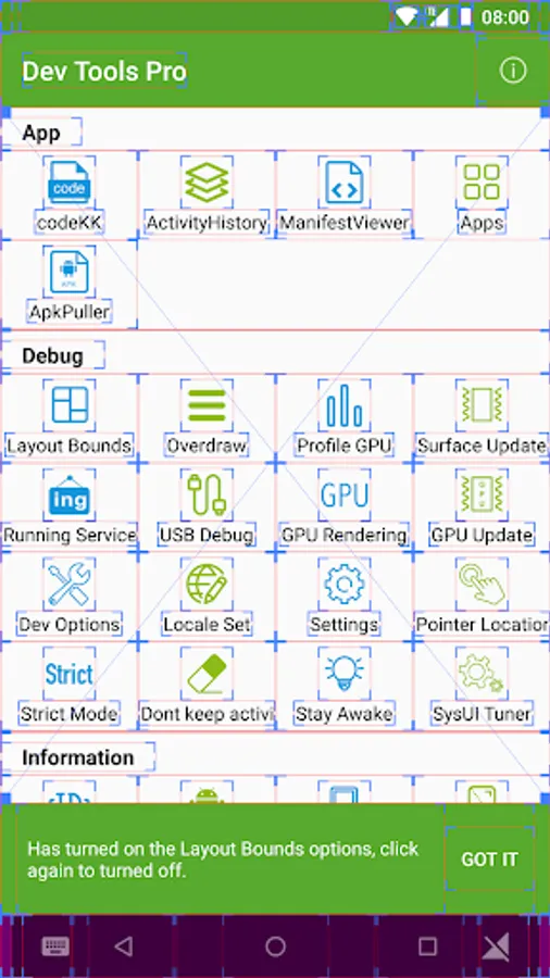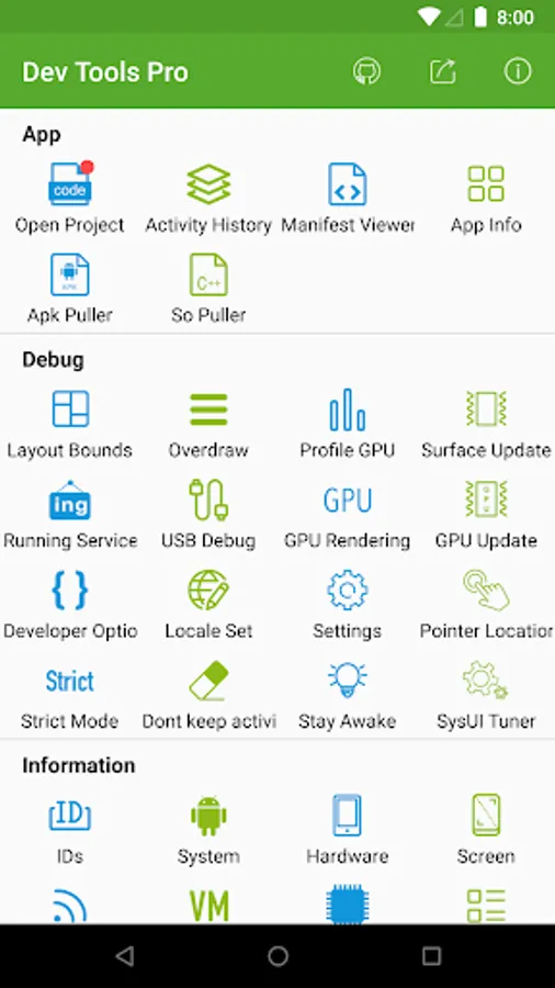 Android Dev Tools Pro is a powerful, productive, automation, essential Android Development Assistant, It can improve your development productivity. It can be used to decompile other app, view layout detail info of other app, view color of screen(color sampler or eyedropper), view the latest open source projects, view activity history, view manifest of any apps, view recently used or installed apps, extract apk or so, debug applications, view phone hardware and software-related information and so on, the more features will be added later. including: