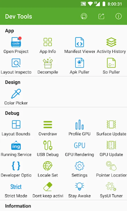 Android Dev Tools is a powerful, productive, automation, essential Android Development Assistant, It can improve your development productivity. It can be used to decompile other app, view layout detail info of other app, view color of screen(color sampler or eyedropper), view the latest open source projects, view activity history, view manifest of any apps, view recently used or installed apps, extract apk or so, debug applications, view phone hardware and software-related information and so on, the more features will be added later. including:
