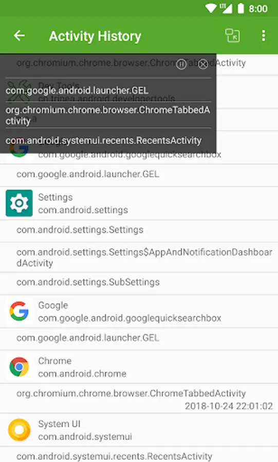 View the appName, packageName, title, icon, start time of the activity opened, also include current activity, top activity. support open in small window mode.