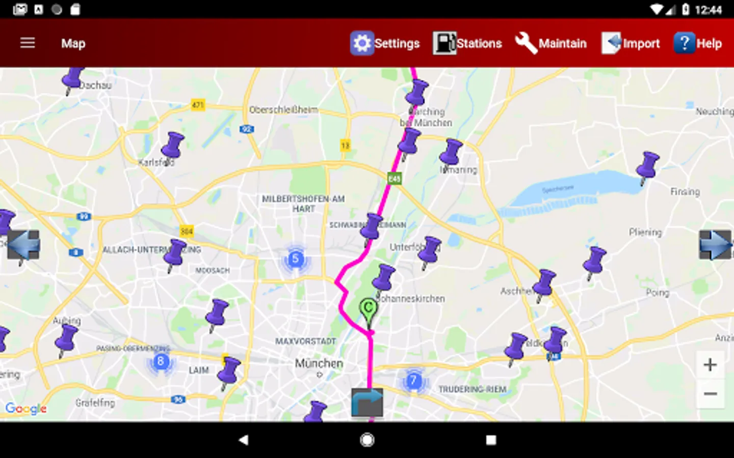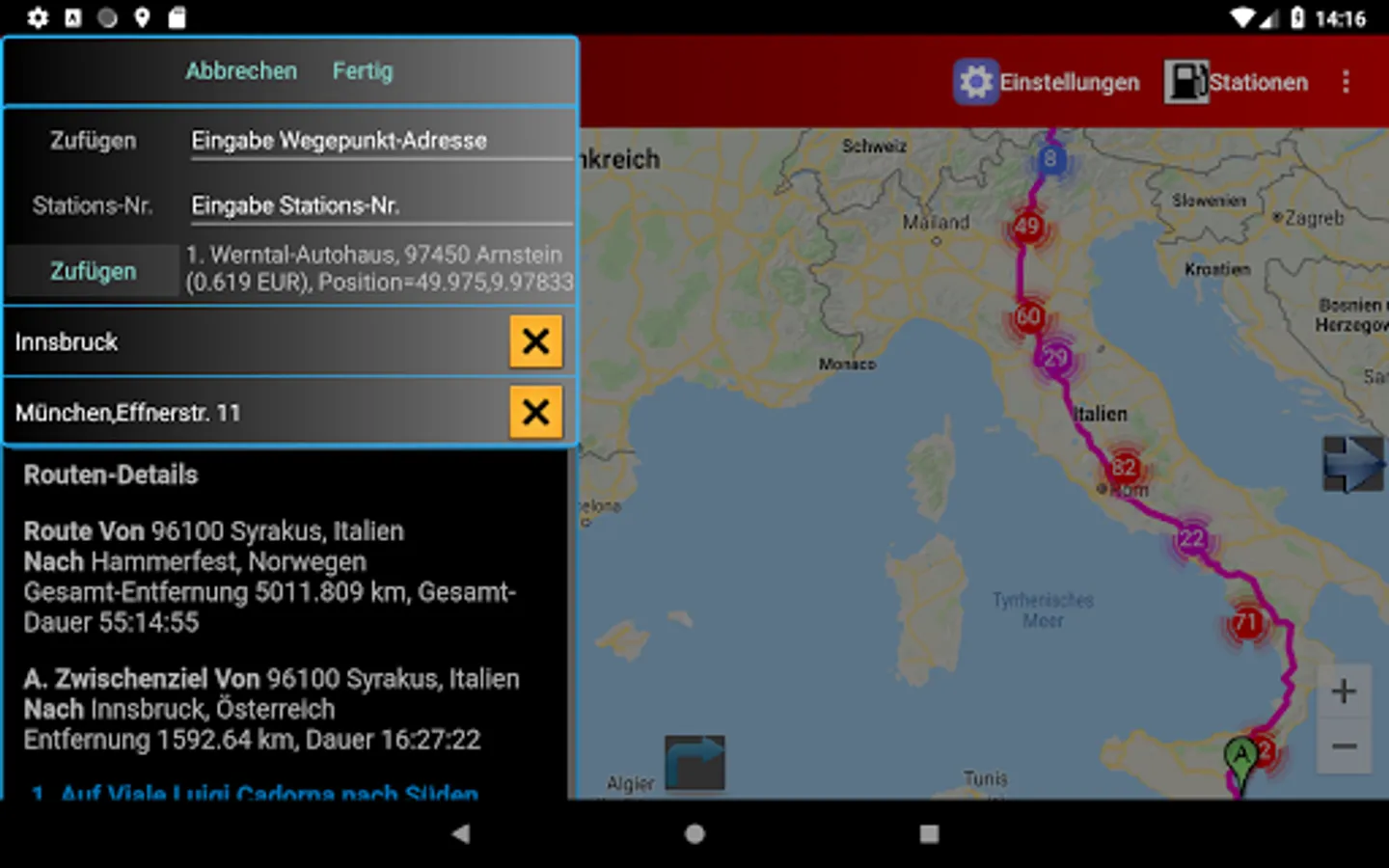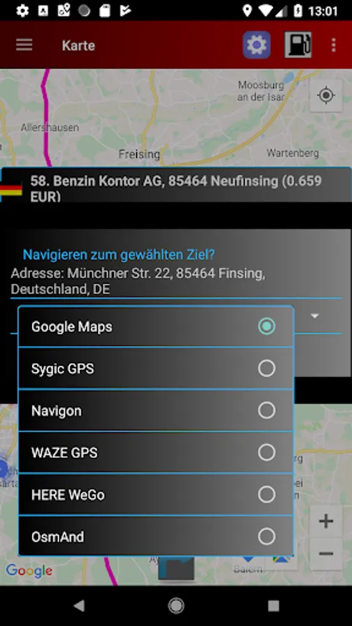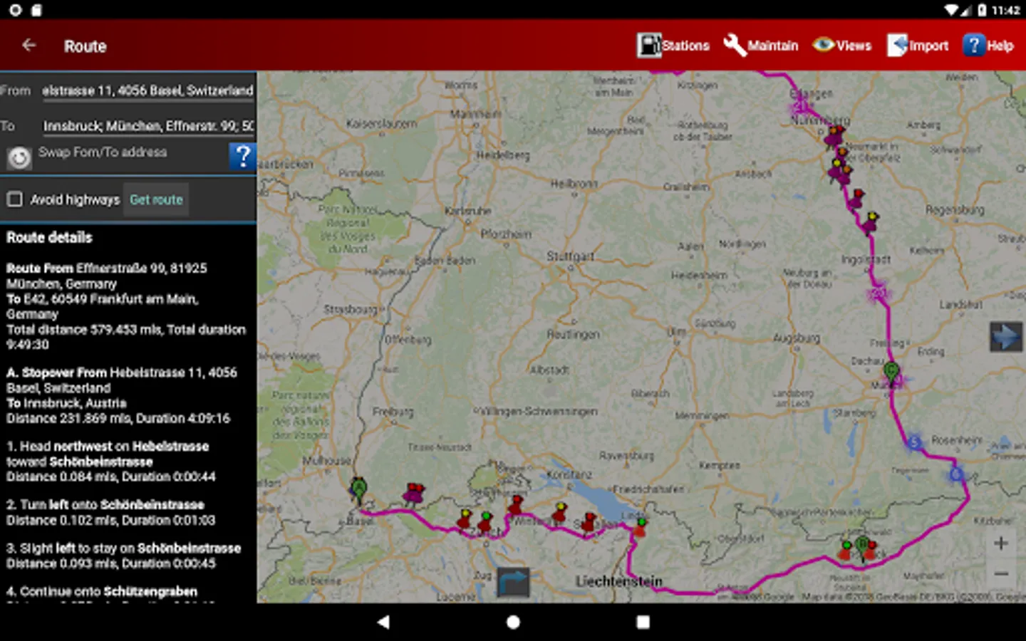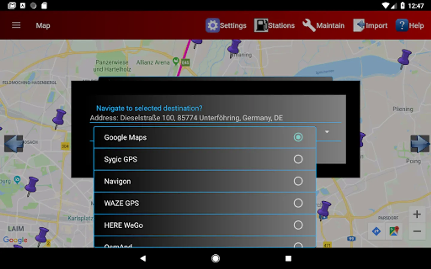 If Google Maps Navigation, Sygic GPS Navigation, Navigon or WAZE GPS is installed on the android device the user may navigate from his current position to the selected route or station marker.