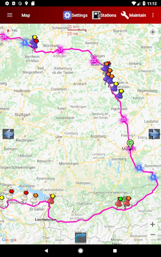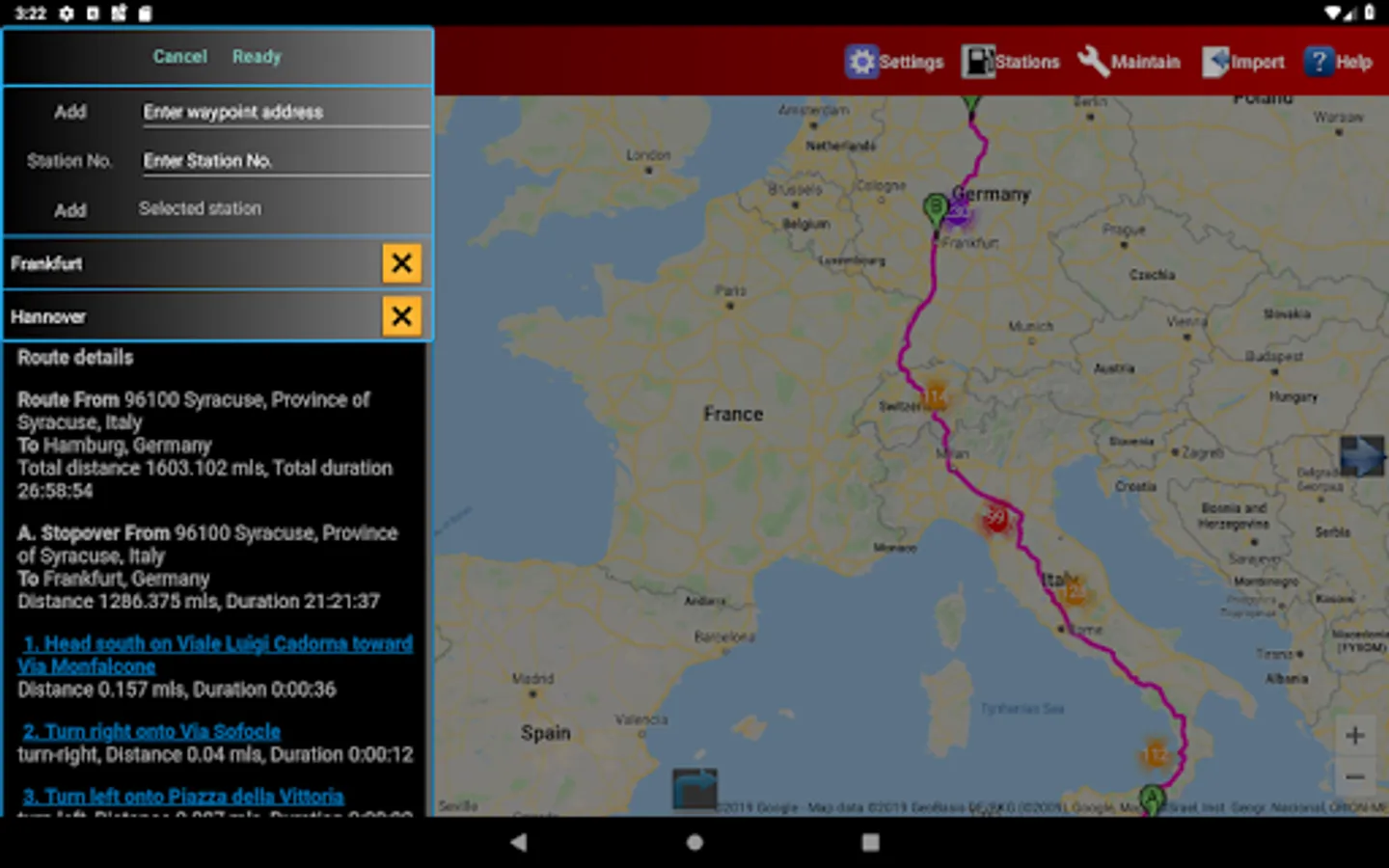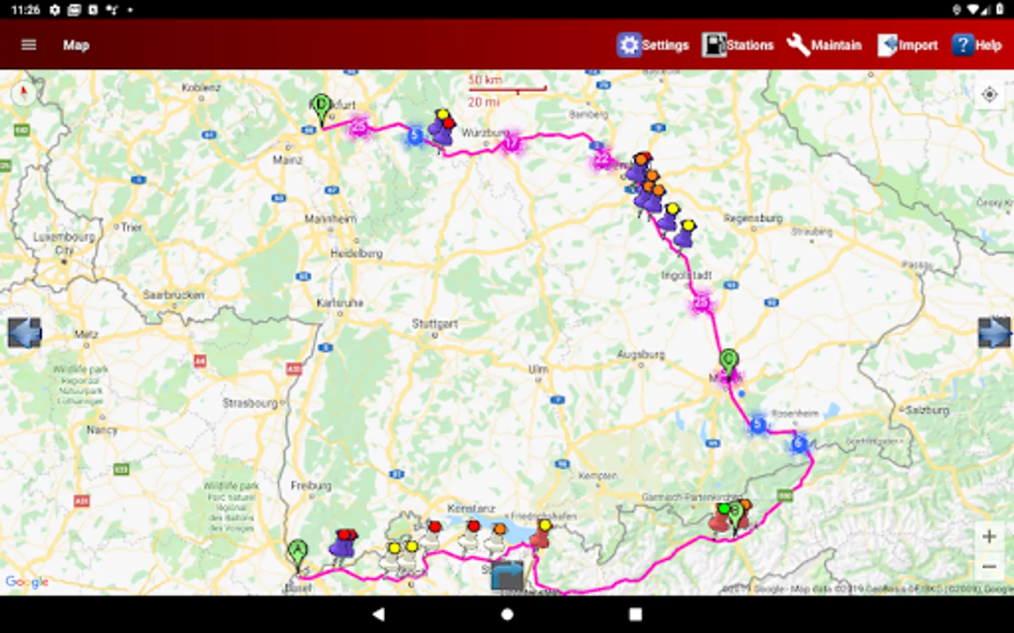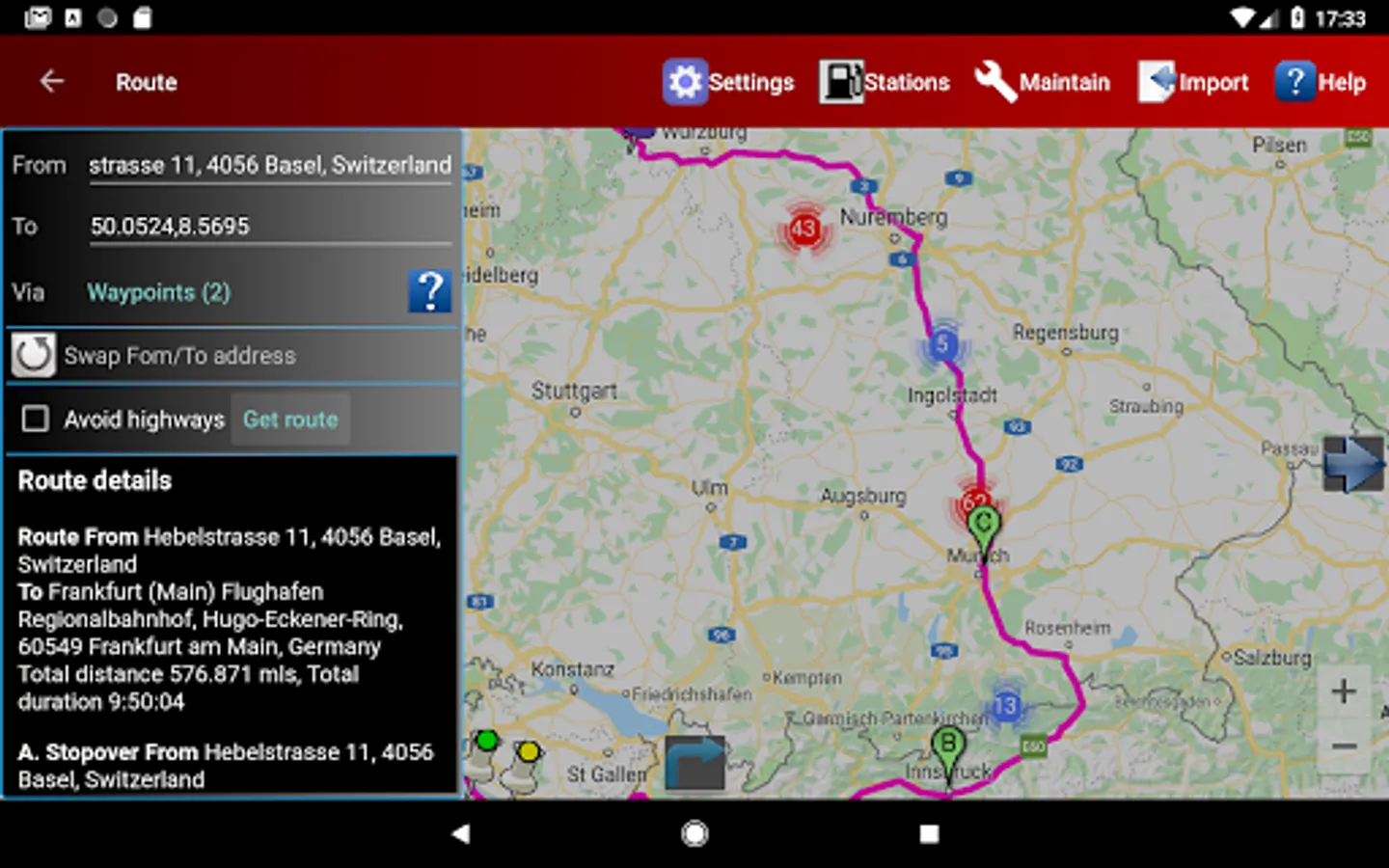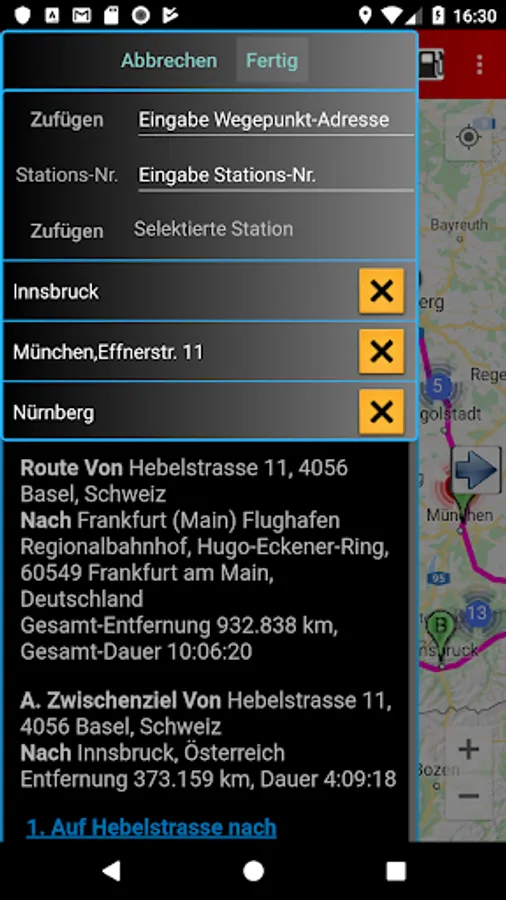 If Google Maps Navigation, Sygic GPS Navigation, Navigon or WAZE GPS is installed on the android device the user may navigate from his current position to the selected route or station marker.