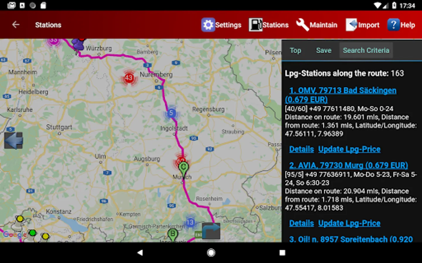 Stations are searched along the route, around the current location or a location given by an address entered by the user. Parameter is the maximum distance from the route or from the location.