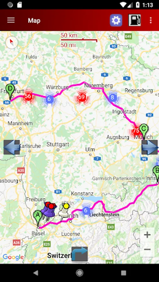 To ease finding well priced gas stations the markers are tagged by colored price indicators.