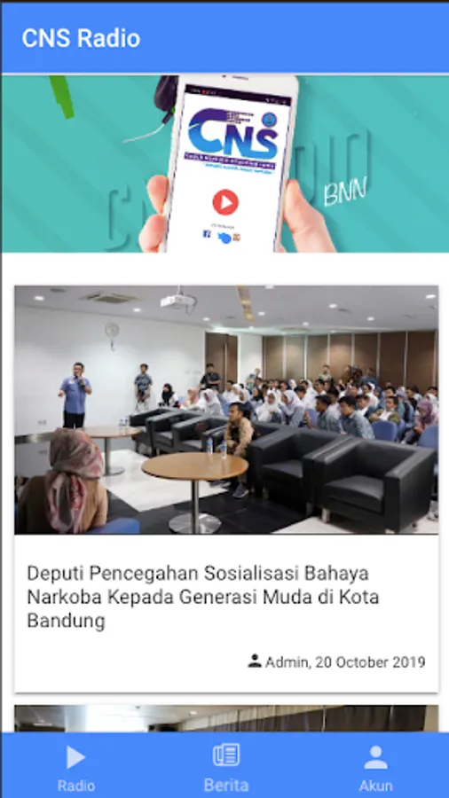 CNS (Prevent Narcotics Streaming) Radio-based streaming radio that is intended as a bridge to the public to communicate and convey information and education, in an effort to prevent the danger of drug abuse and illicit trafficking. CNS Radio is managed by the Information Dissemination Directorate, Deputy for Prevention of the BNN Republic of Indonesia, whose mission is to spread the dangers of drug abuse and have a vision of a healthy and clean Indonesia from the dangers of drug abuse.