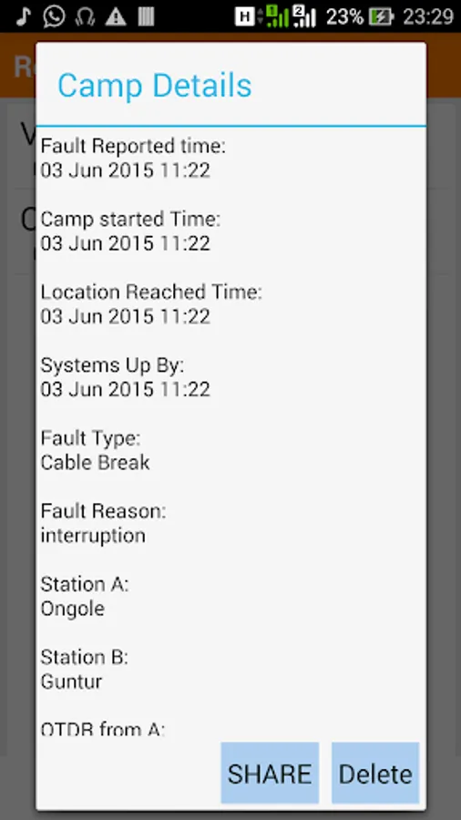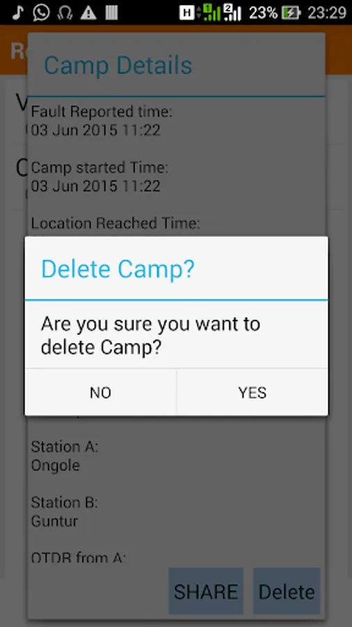 - Click on any camp to see details, and you can delete the camp or share the camp to your officer via whatsapp/facebook/mail.