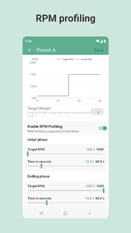 One of the key features of the companion app is the ability to adjust your grinder with finite detail. Even when not connected to your grinder, you can set three grinding programs by both speed and target weights. In a dedicated section, choose your target weight, enable RPM profiling, and receive readings from previous sessions. Receive data about every grind you perform.