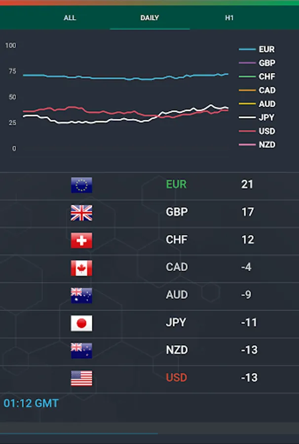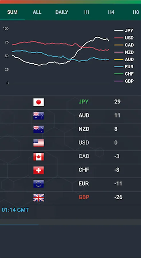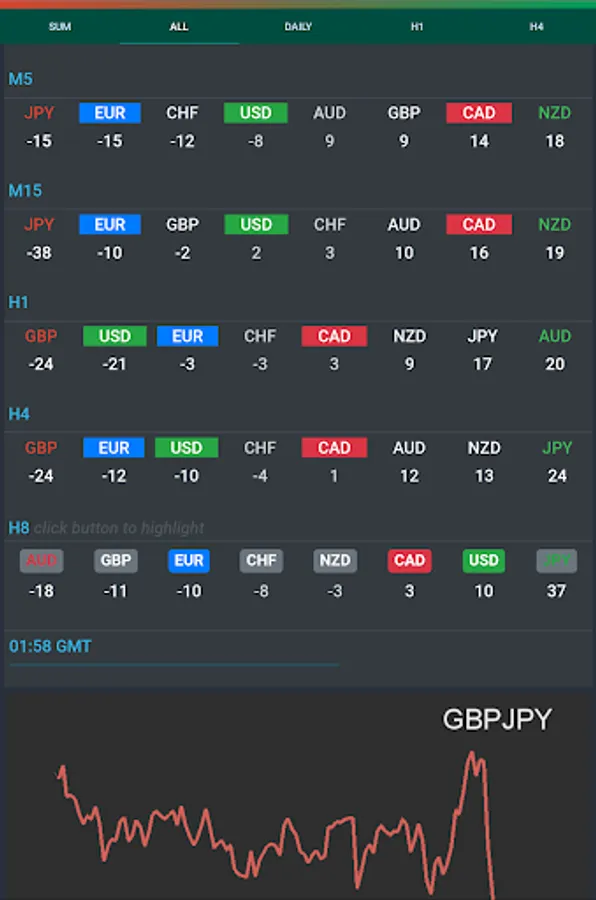 Daily, Weekly, 4-Hour, 8-Hour, Minutes Currency Strength Meter.