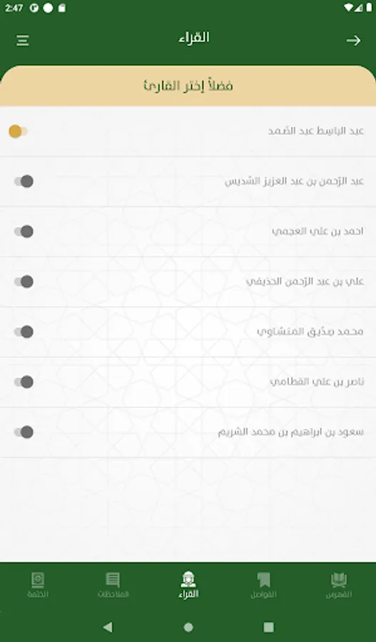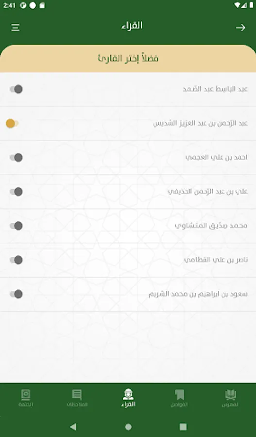 2- High quality recitation by the most famous reciters (Abdul Baset Abdul Samad, Muhammad Siddiq Al-Minshawi, Abdul Rahman Al-Sudais, Ahmad Al-Ajmi, Abdul Rahman Al-Hudhaifi, Nasser Al-Qatami, Saud Al-Shuraim).