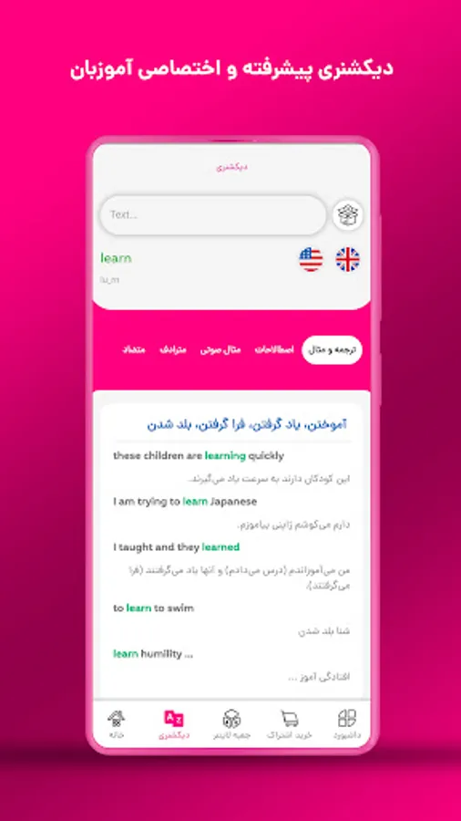 - کامل ترین دیکشنری انگلیسی به فارسی با تلفظ امریکن و بریتیش لغات، مترادف و متضاد های کلمه، اصطلاحات و مثال های صوتی متنوع با ترجمه اختصاصی برای هر کلمه