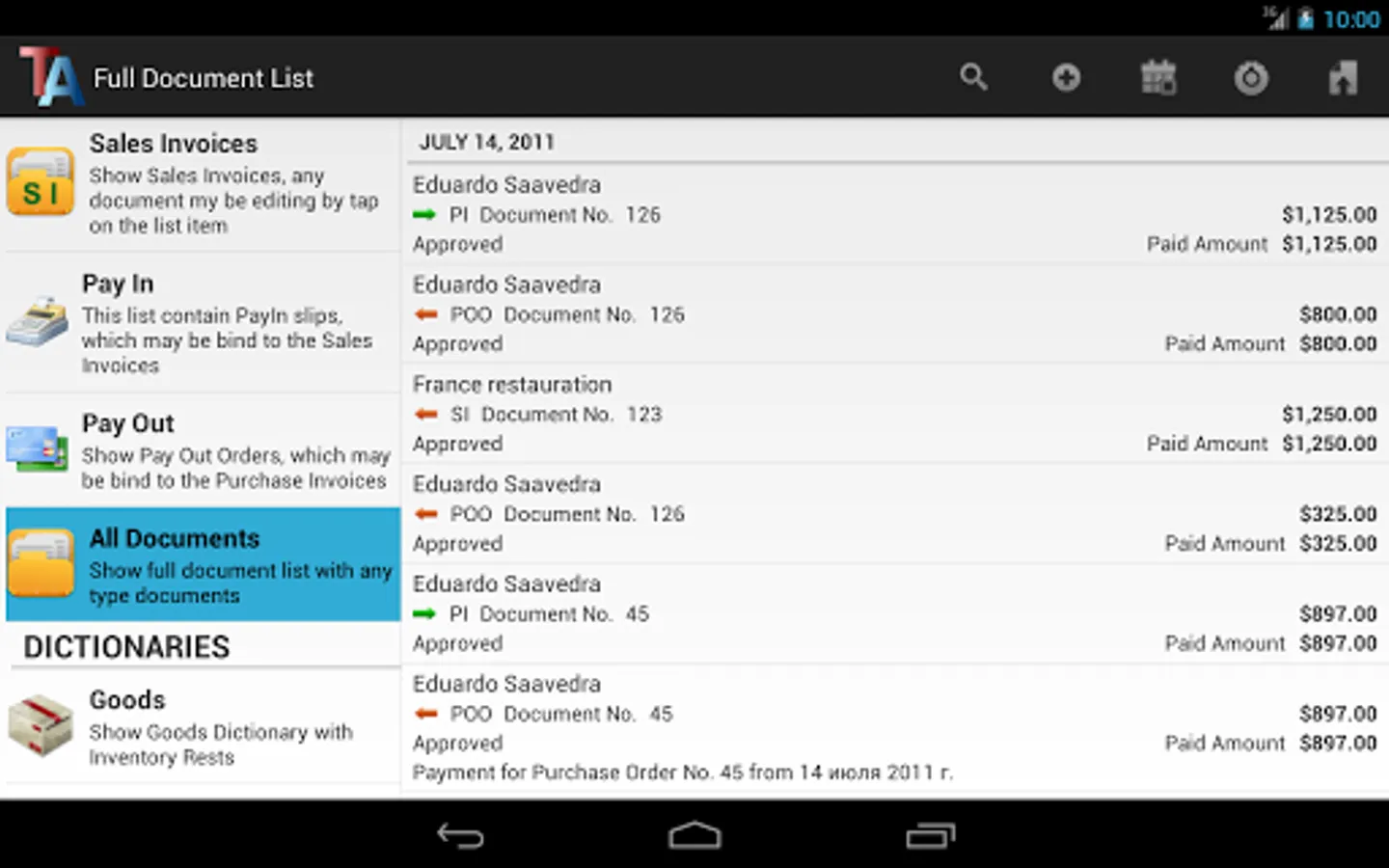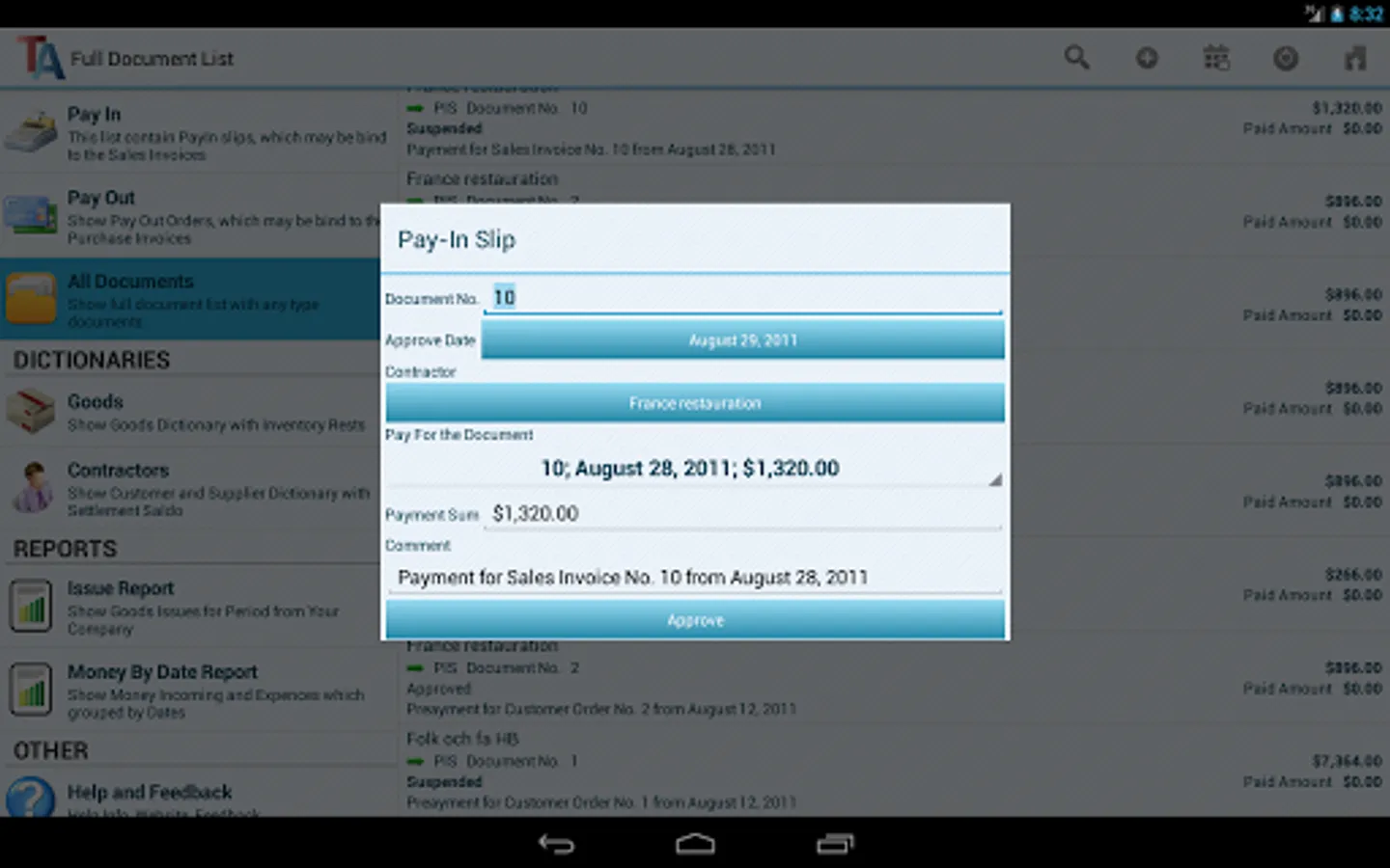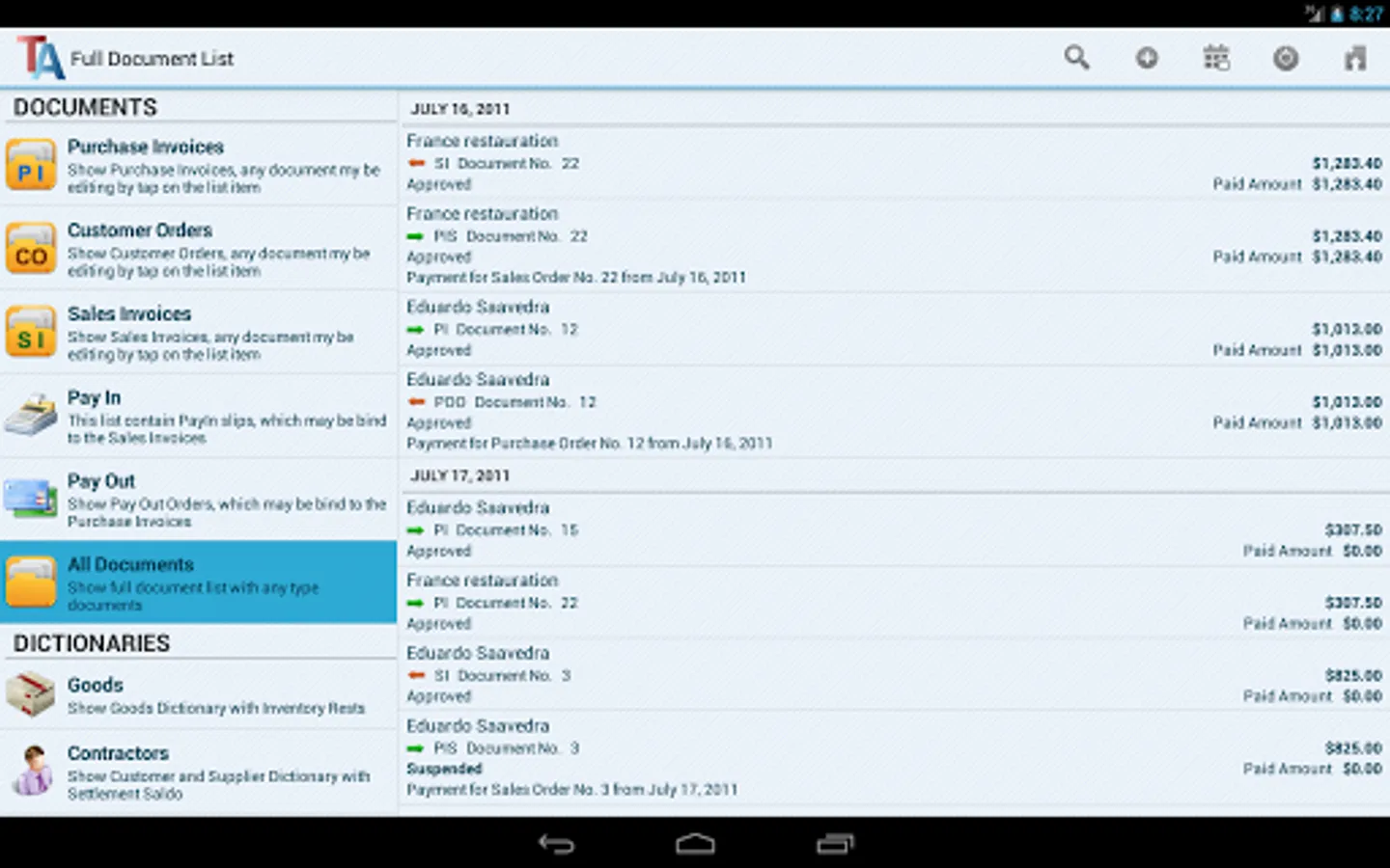 Contains all the essential business operations. Invoices, Orders, Payments. Products and services. Purchasing and sales, money incomings and expences, customers orders. Inventory rests and mutual settlements are calculated automatically. Inventory history for any time period for any product or service. Intended for use in various businesses - hairdressers, plumbers, salesmen, etc.