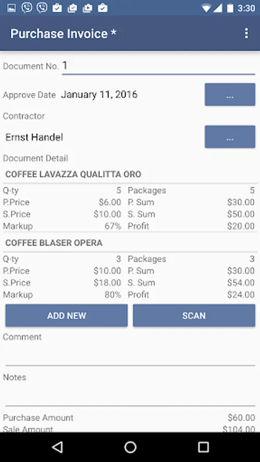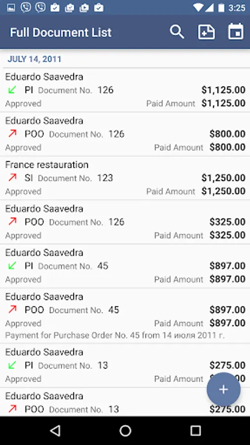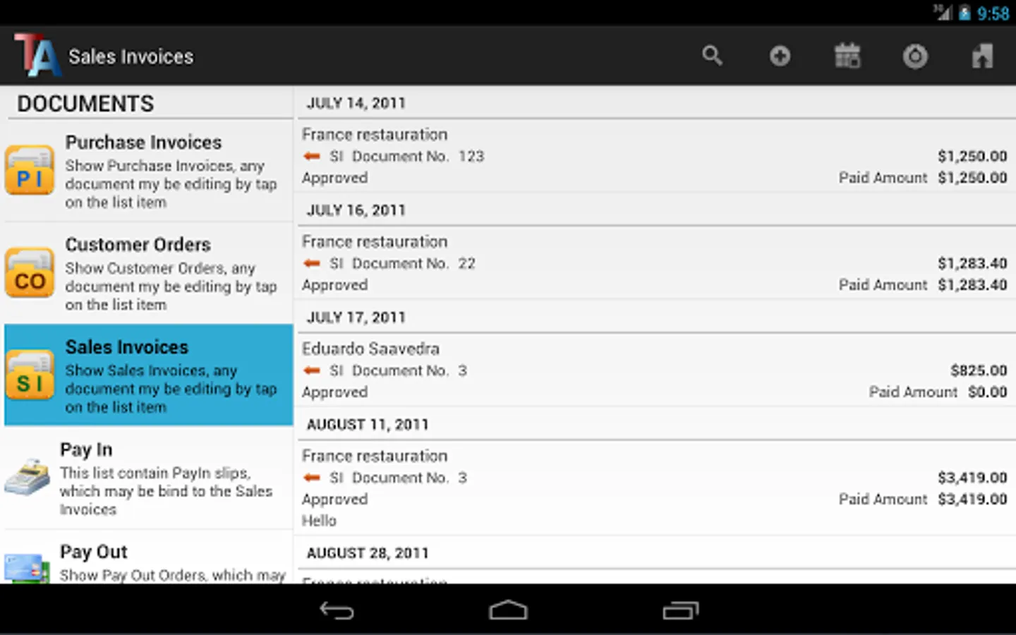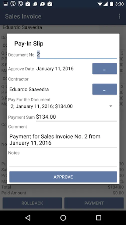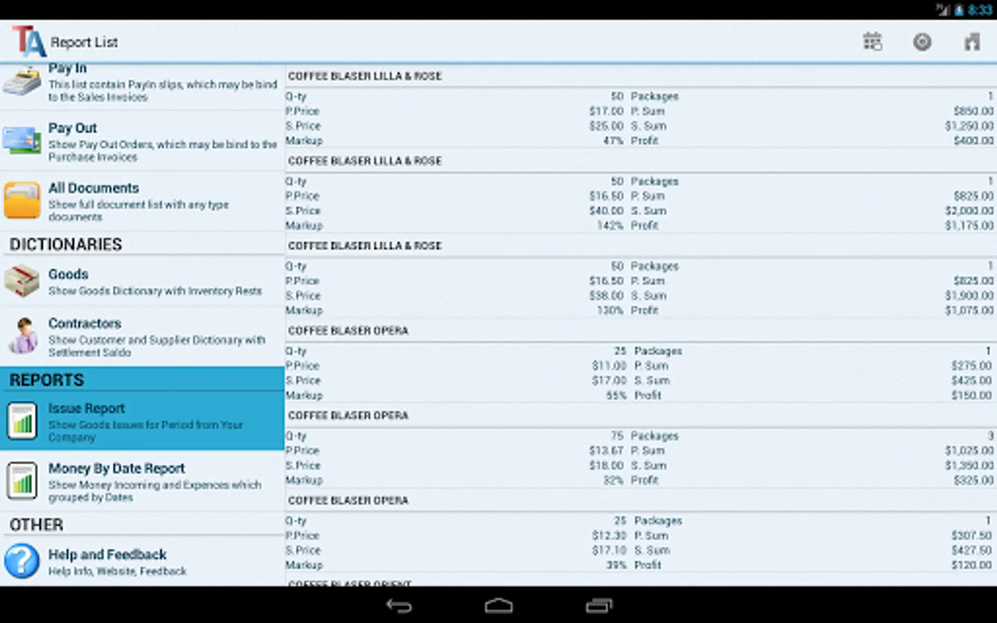 Contains all the essential business operations. Invoices, Orders, Payments. Products and services. Purchasing and sales, money incomings and expences, customers orders. Inventory rests and mutual settlements are calculated automatically. Inventory history for any time period for any product or service. Intended for use in various businesses - hairdressers, plumbers, salesmen, etc.