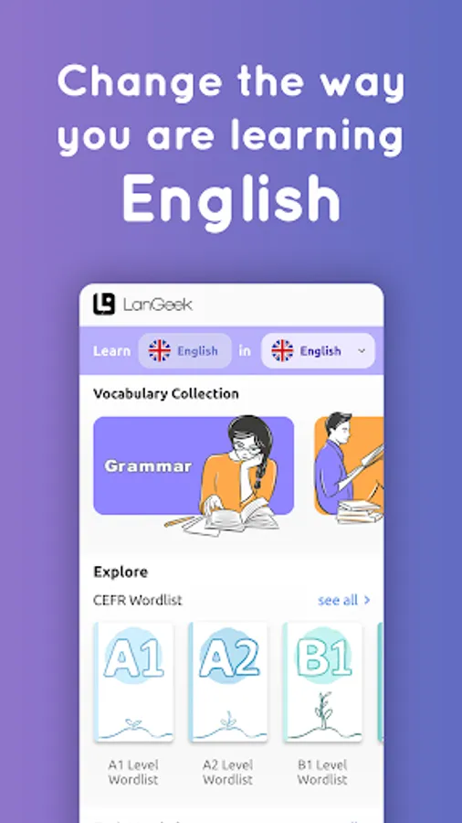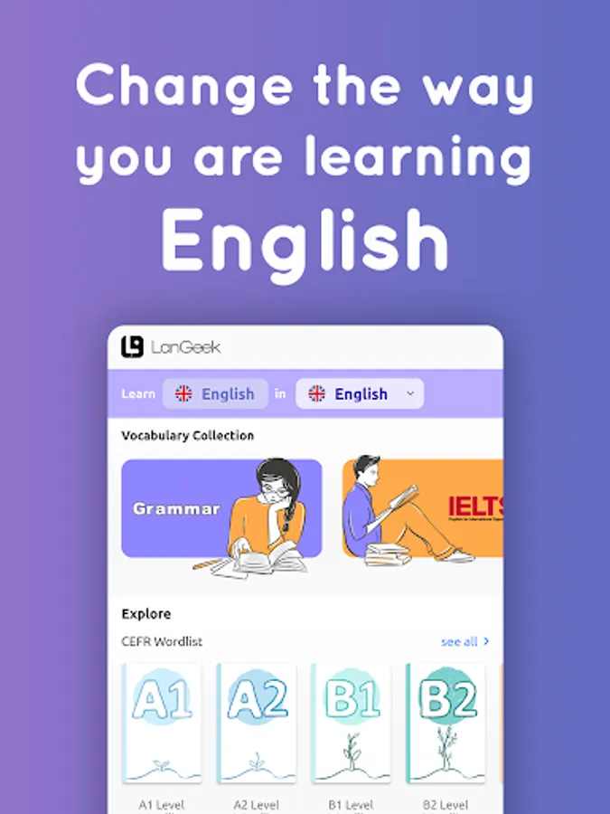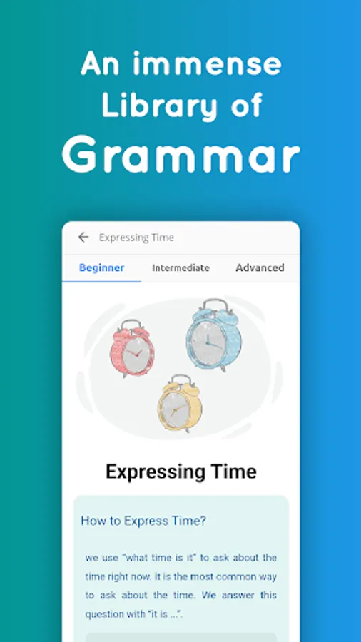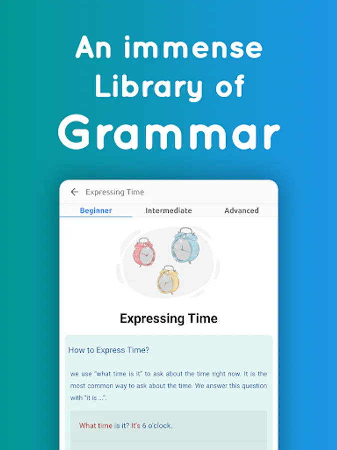 LanGeek app includes a thorough grammar library including all major and minor grammatical topics of English language.