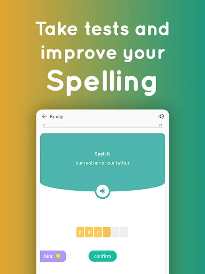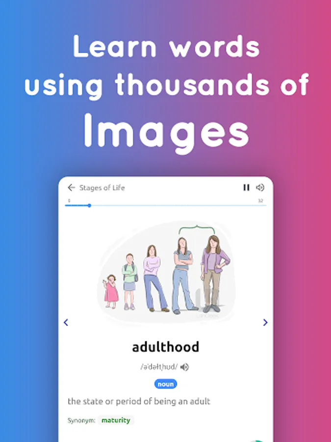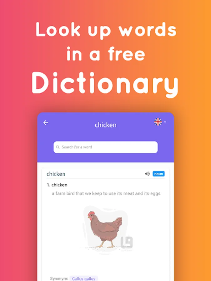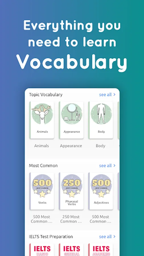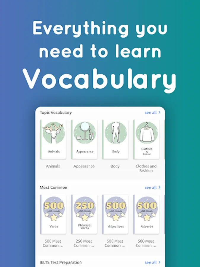 More than 20000 English words, categorized into different lessons based on their level or topic. Vocabulary lesson includes: