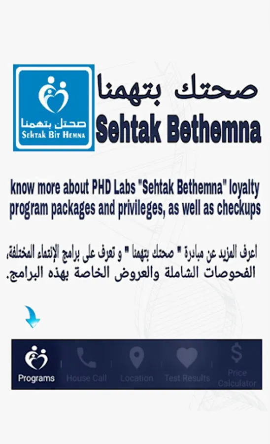 PHD Labs app enable users to browse PHD Labs Tests catalog and viewing detailed information about each test, including prices. Also it enables users to receive and view their tests results and schedule a house call visit. PHD Labs app also provides full information about our program ”Sehtak BiT Hemna” “صحتك بتهمنا” packages, included tests, fees and discounts.
