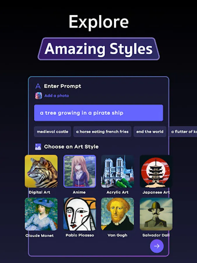 - Diverse Artistic Styles: With over 10 different styles at your fingertips, Airt offers an expansive range of artistic expressions to suit your preferences. Whether you're captivated by the allure of realistic art, the charm of painting styles, the vibrant world of anime, or the timeless elegance of black and white, Airt has something for everyone.