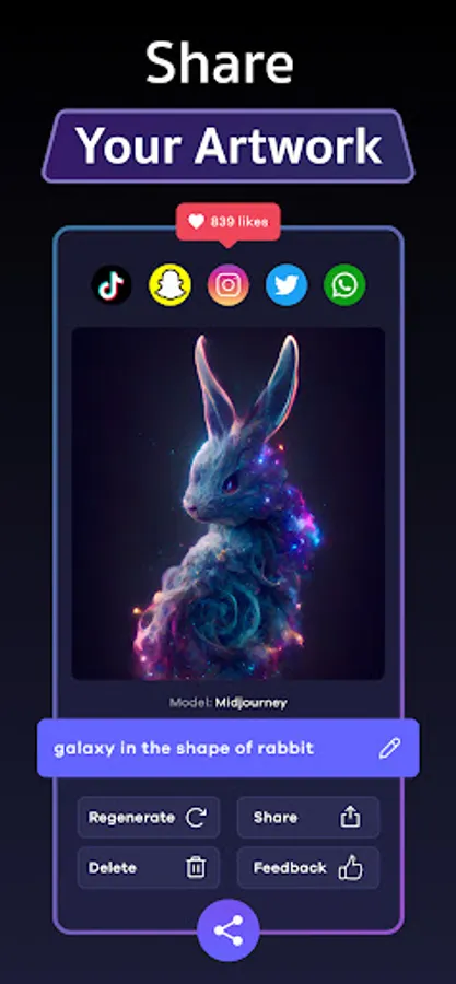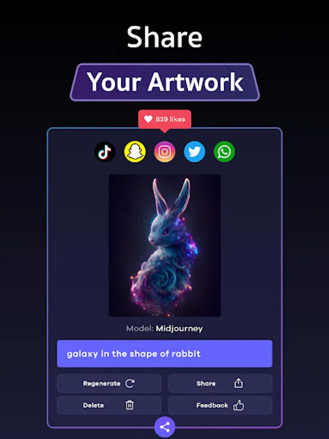- Share and Inspire: Showcase your artistic prowess with the world! Airt seamlessly integrates with popular social media platforms, allowing you to effortlessly share your creations with friends, family, and followers. Spread the beauty and ignite inspiration among your peers as you become a part of the vibrant Airt community.
