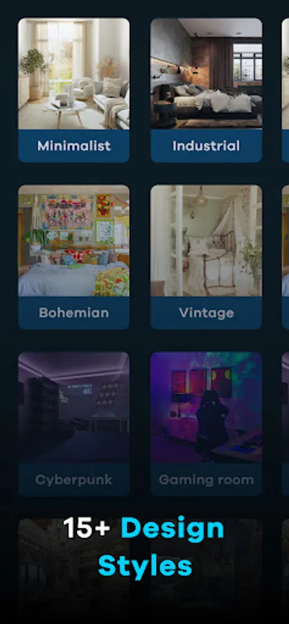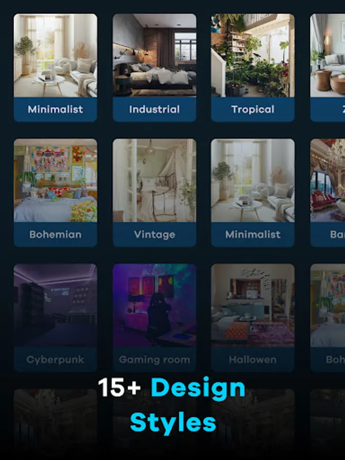 - Diverse Style Selection: Discover your perfect aesthetic from a wide range of 10+ different interior design styles. Whether you prefer a modern, industrial, tropical, zen, or any other style, our app has you covered. Experiment with various combinations and find the perfect fit for your unique taste.