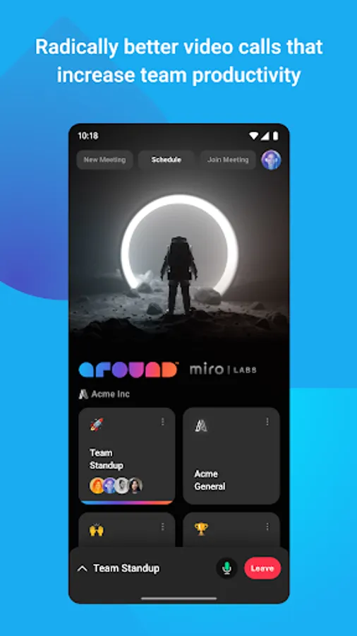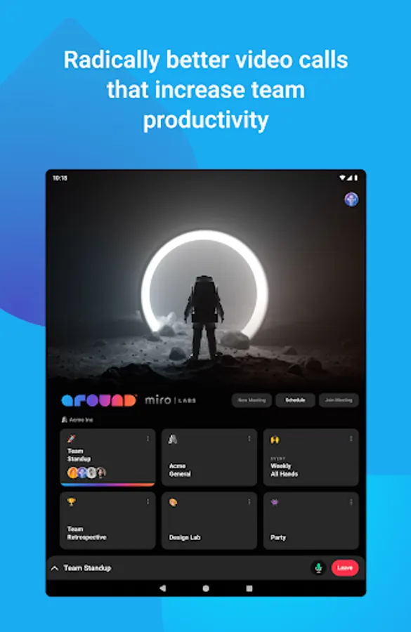 With Around by Miro Labs (Around), your teams can seamlessly co-create, hear, and see each other from one single space—no matter where they are. Around’s engaging and immersive rooms are designed to make deep connections among teams and foster high energy engagement. With Around, your team will feel the inspiration and focus on creating the next big thing.