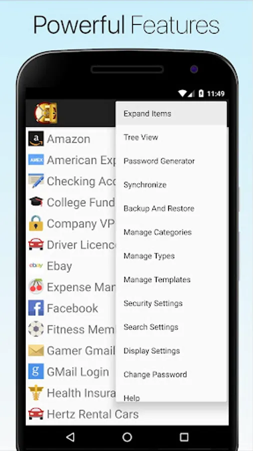 The Leading Password Manager for Android Phones & Tablets ◆ AES Encryption ◆ Fingerprint Authentication ◆ Synchronization ◆ Automatic Backups ◆ Password Generator ◆ Flexible Templates ◆ Advanced Security Options