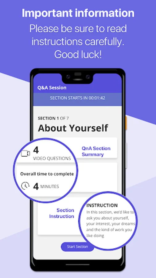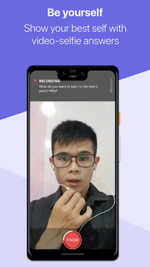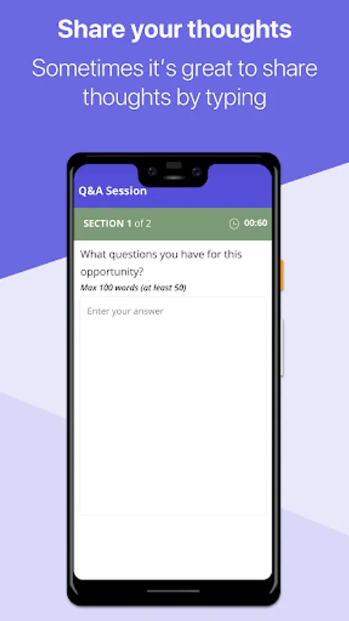 How does it work? After you have installed the app, you need to click on the link or enter the code, found in your invite email from the company. You will then find the interview questions the company has designed for you with an explanation. In the app you can record your video-selfie replies, one question at a time. The company may use the “no-rerecording”feature so be careful and think carefully about your answers. The replies are strictly confidential and can only be seen by the company.