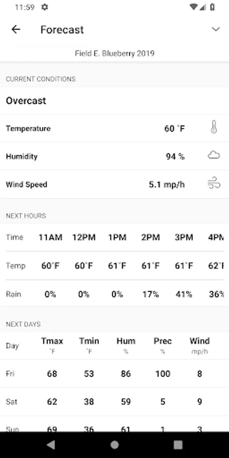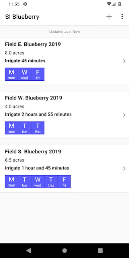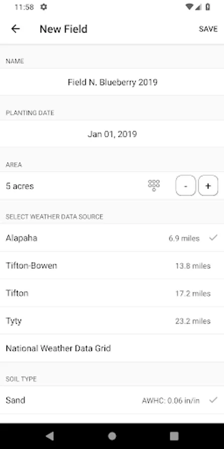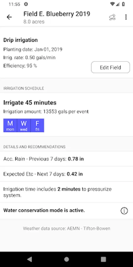 This App was developed to give blueberry growers a smartphone accessible program to irrigate newly established to mature blueberry plantings. The irrigation calculations recommend irrigation rates based on evapotranspiration, precipitation, soil type, and drip irrigation system rate.