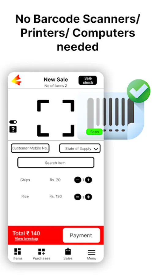 NO BILLING DEVICES NEEDED: Say goodbye to barcode scanners, printers, servers, computers etc… as `Checky: Business` can do the job of all those devices by only using your mobile phone. Scan barcodes, send bills and invoices via Whatsapp, Create and manage your purchases, sales, inventory, suppliers and customers, receive payments for sales, provide discounts and much more by only using your mobile phone.