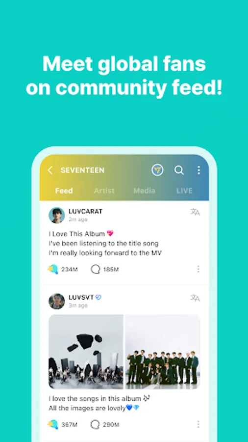 · Want to know what other fans from other countries are saying? Use the auto-translation feature to overcome the language barrier! Posts and comments by artists can also be translated as well.