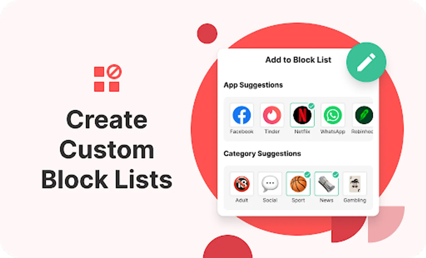 🕮Category Blocking: With category blocking you can block thousands of websites and apps in one click. The categories we offer are: adult content, social media, shopping, news, sports, and gambling.