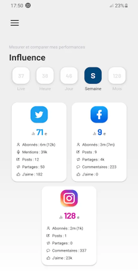 📈 Real-time influence measurement: view and compare your social media activity live, thanks to detailed reports. Measure yourself against your competitors on different social networks and different periods: last minutes, hour, day, week, month, ...