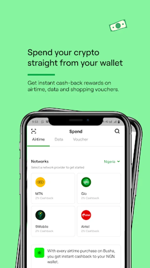 1. Busha Spend: Use your Busha wallet to purchase airtime and data subscriptions directly, earning instant cashback to your wallet.