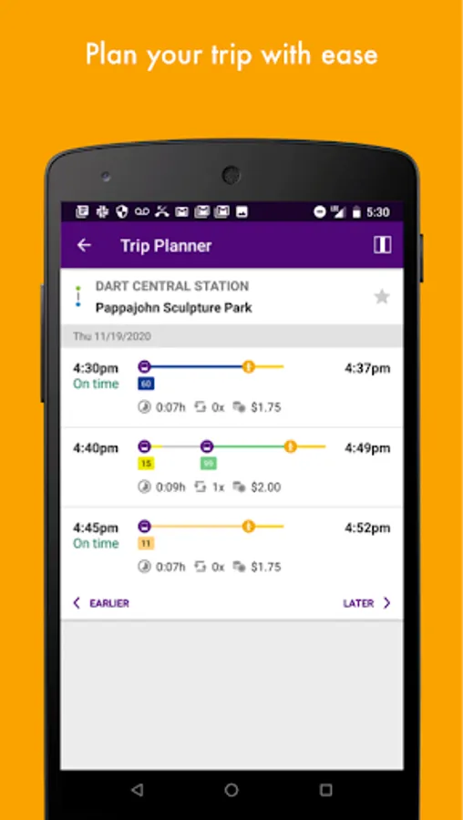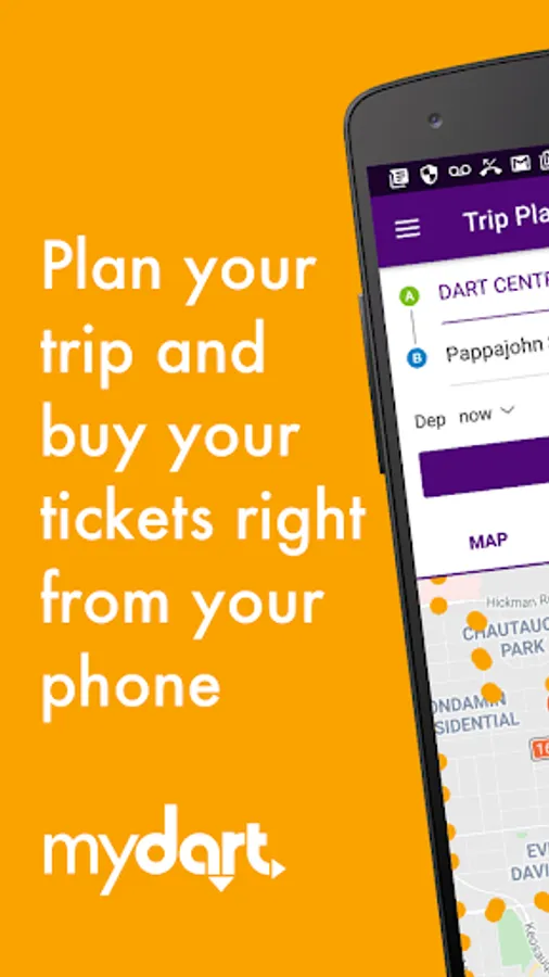 Use the MyDART app to plan a trip and access real-time arrival of buses. Enter your starting point and ending destinations for trip options that best fit your schedule. Use the Next DART Bus feature to get the real-time arrival of buses and view a map of DART bus stops near your location.
