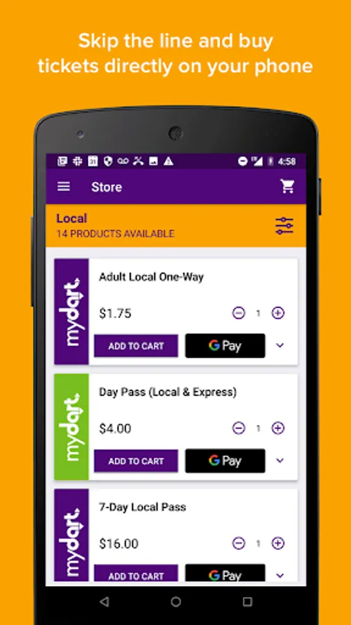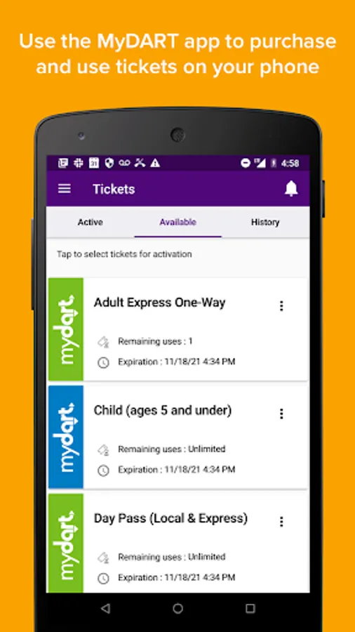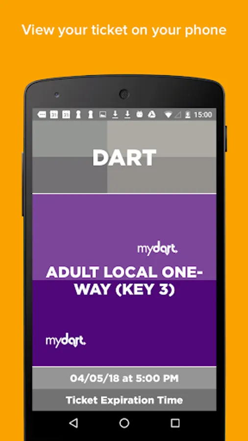 Buy your bus pass in the MyDART app and start using it on your schedule. DART offers one-way, day, 7-day and 31-day passes for use on all services. When ready to board the bus, activate the mobile ticket you want to use and show your phone to the bus operator to pay fare. If you are a Paratransit or Half Fare customer, contact Customer Service at 515-283-8100 to add those tickets to your MyDART account.