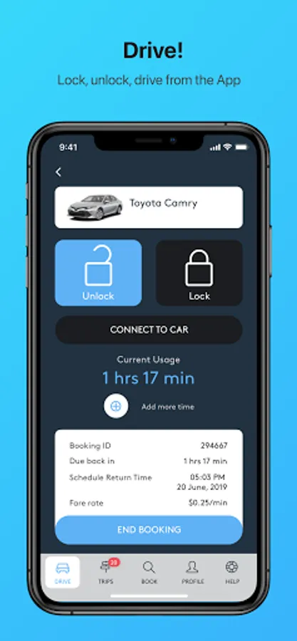 Once the customer confirms the vehicle type by location using geo-tracking, and by availability, one can proceed to the vehicle. The software works seamlessly with the telematics with commands from the app. The commands are to unlock, enable and quit the session. If the customer commits to enable the vehicle, the vehicle becomes active for the allotted time. A customer has chance to cancel the block of time within the first 15 minutes of the rental at no charge. The customer also has the option of extending their time within the app.