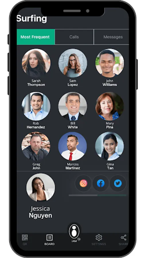 Don’t go to remotely located social media icons to look for your friends anymore, instead go to the iAM Surfing Board to instantly visit your friend’s social media feed. iAM Surfing allows you to navigate through your contact’s social media feeds with a click. Click, and go from John’s Instagram, to Nancy’s Facebook; click again and go from Juan’s Twitter to Brenda’s LinkedIn. Surfing lets you ride the wild wave of social media.