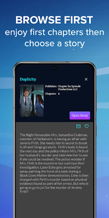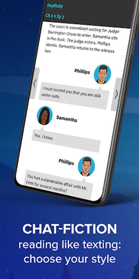 The reader is very simple and user friendly. Most stories are organized as chat messages. Choose the font size and navigate the table of contents. The controls are user-friendly and your reading progress is saved. Save your favourite books into favorites. Search books by text, author, description or title.
