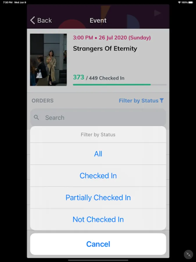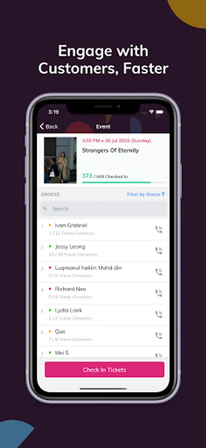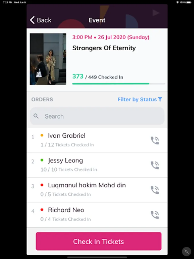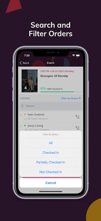 - Search and Filter Orders: Check which attendee showed up by searching their name or phone number. You can also filter your orders by their check-in status.
