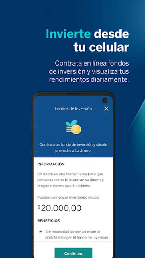 - You can request additional resources on your current consumer credit through a credit check, hire a CDT, a payroll advance and investment funds digitally without having to go to the office.