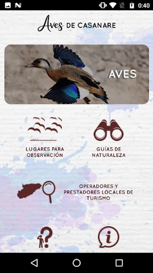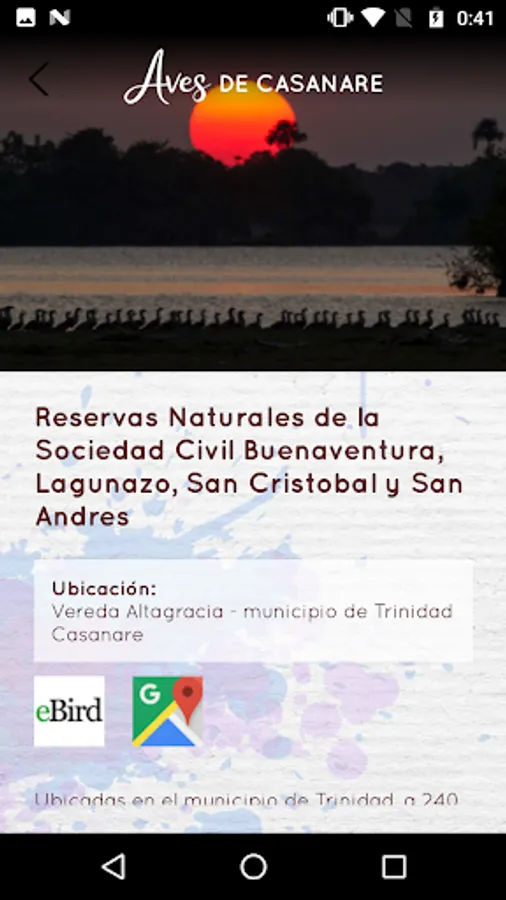 In this App you will find relevant information to plan your trip to the plain. It has recommended places that are currently developing tourism in the municipalities of San Luis de Palenque, Trinidad and Maní, where you can observe birds and nature in general. It also suggests local tourism operating companies and people who live in the region and are accompanying the guides to these wonderful places to enjoy bird watching. Many of these local people have been trained in the framework of this process with the Casanare Governorate.