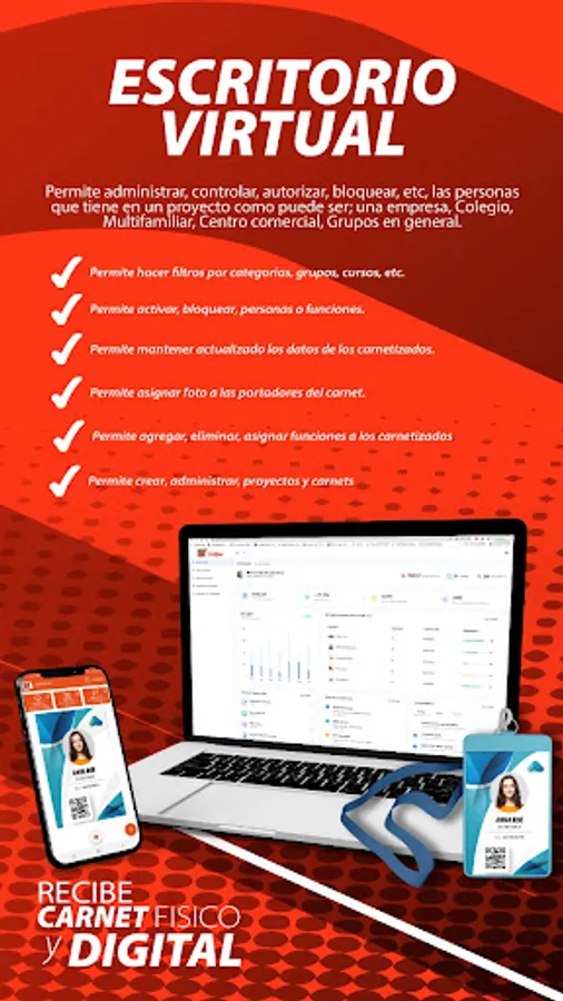 It is a tool that allows the creation, publication, upload to the device and validation of a digital card, for the latter, authorized users through the validation Mobile App or through QR code reading devices, can verify that the person carrying of the card, be really who you say you are.