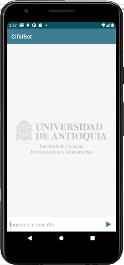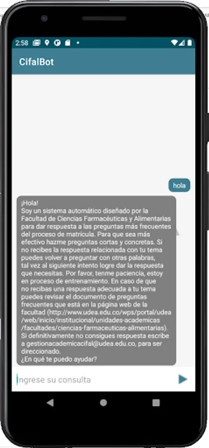 Cifalbot is a conversation application with automatic responses about the enrollment process at the Faculty of Pharmaceutical and Food Sciences of the University of Antioquia. The application is fed with the answer to the most frequent questions of the enrollment process. To be effective, short and specific questions are asked.
