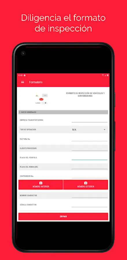 Application that allows container inspections and any type of vehicle following safety standards, adding photographic material and including functionalities for monitoring management.