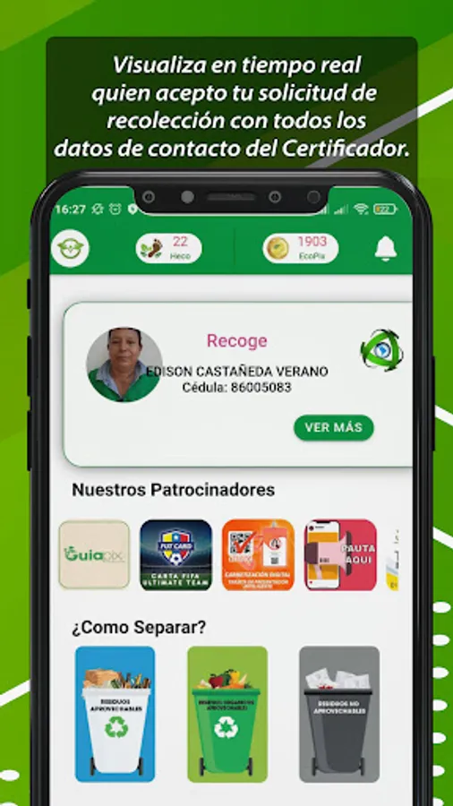 👨🦰We dignify the work of the recycler by trade when you make the decision to download the Recycle App, at that moment, you begin to separate your waste in a correct way, we teach you; Then, you will deliver them to the now aptly named, ENVIRONMENTAL CERTIFIER.