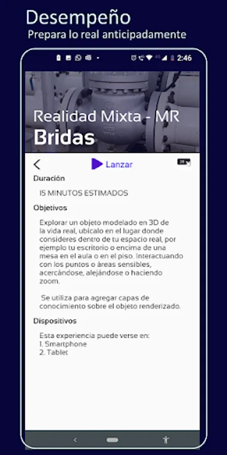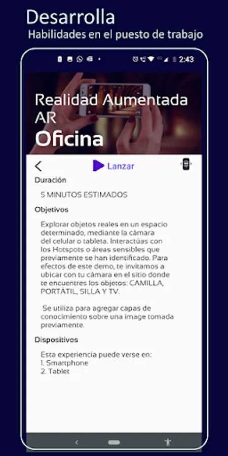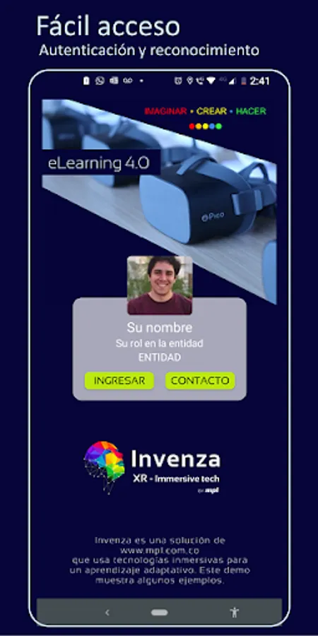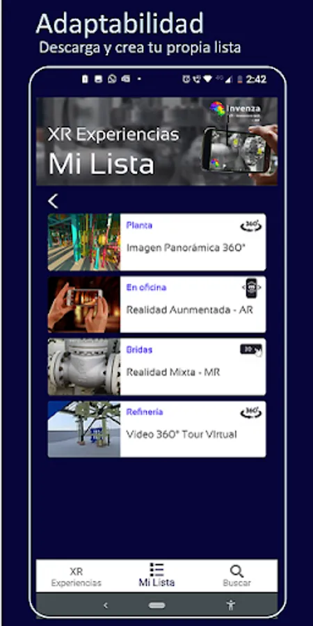Invenza is an immersive XR content design service, implemented in a mobile application that authenticates with an LMS in the cloud and locates content according to the user's site and profile. It allows you to download experiences tailored to your entity or company to the mobile of your collaborators, creating adaptive learning in personalized lists for offline execution.