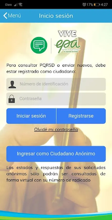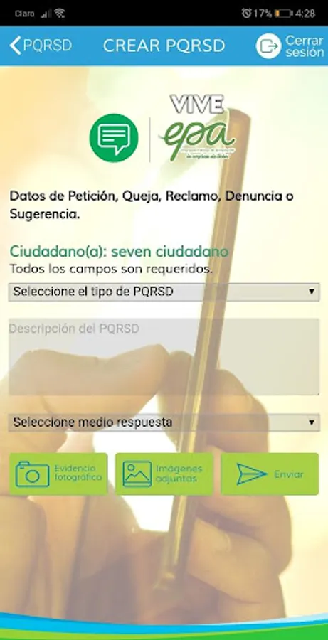 Application that allows a citizen in the town of Armenia - Quindio, Colombia, file a petition, complaint, grievance, complaint or suggestion to the EPA - Public Enterprises of Armenia, from your mobile device allowing attach a photograph and files as evidence. The request is routed to the One-Stop Public Enterprises of Armenia E.S.P. for its management; registered citizens can make tracking the pqrds through your mobile device or from the web address: http://intraepa.gov.co.