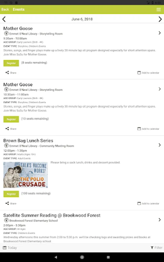 Looking for a library event? View the calendar and register for events right from our app. Find out when the library is open at a glance.