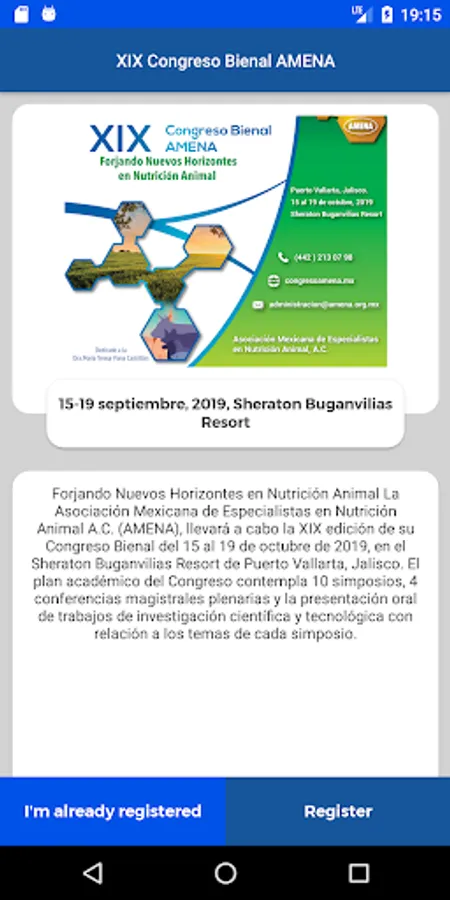 Application of the XIX AMENA Biennial Congress, Animal Nutrition congress that will take place from October 15 to 19, 2019 at the Sheraton Buganvilias Hotel, Puerto Vallarta, Jalisco. Congress information, rates, speakers, prepare your agenda.