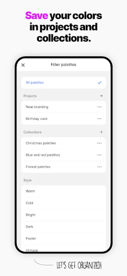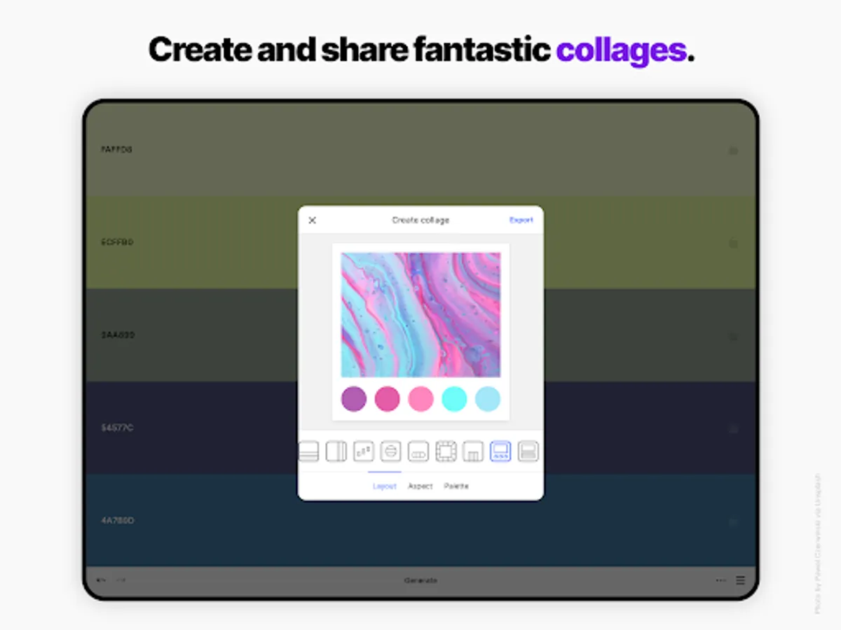 • Choose by several layouts and create beautiful collages with photos and palettes