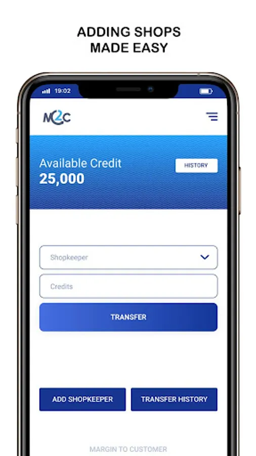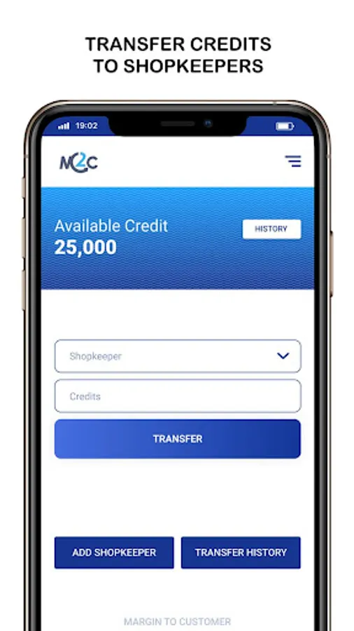 The M2C Distributor app enables the distributors to request credits from admin and transfer credits to the shopkeepers.